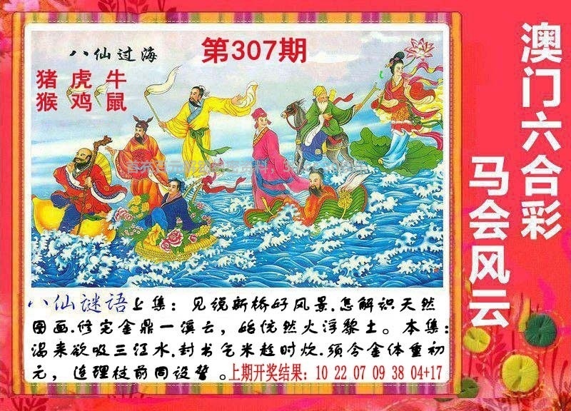 | 306期:【八仙过海】 【见说新桥好风景,怎解识天然图画,修完金鼎一溪云,始恍然火浮黎土】 解:意思是好风景解出风肖虎兔龙,金鼎解出金肖猴鸡 生肖:猪鸡羊兔狗牛 |