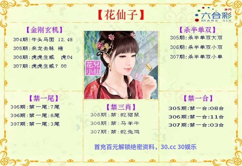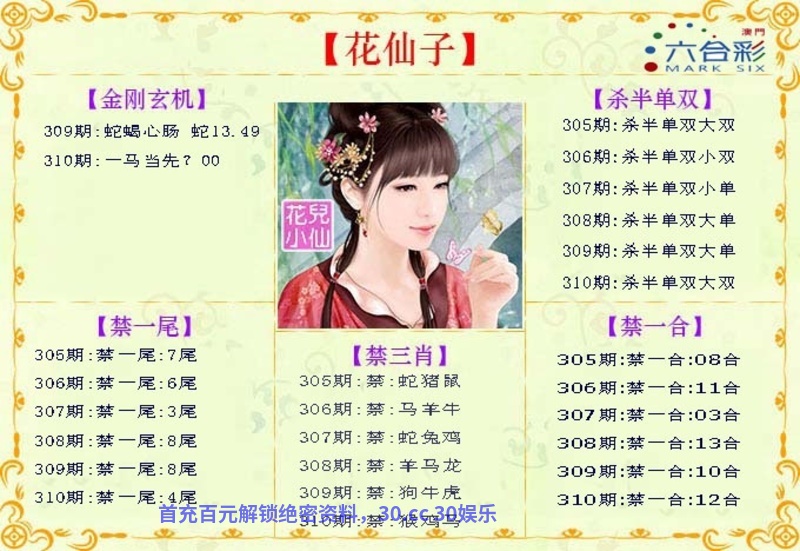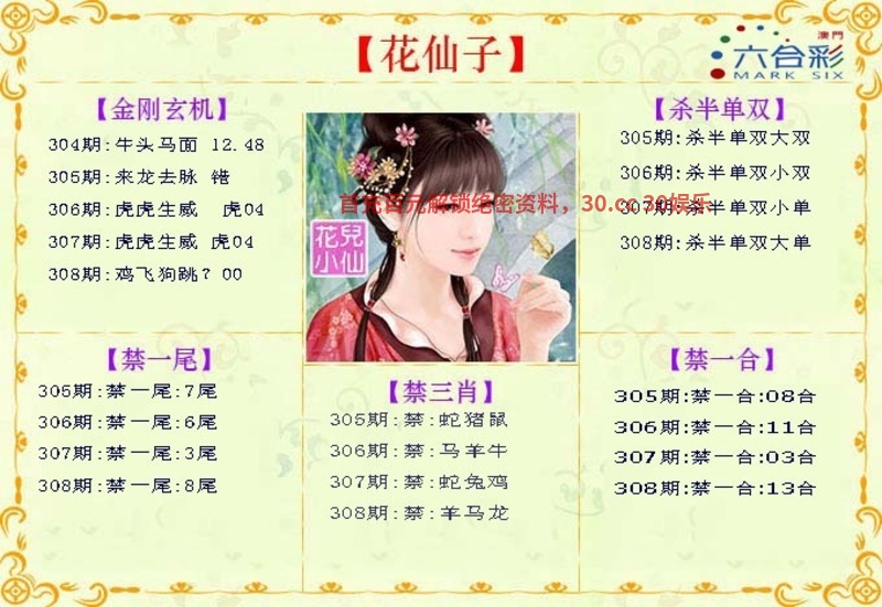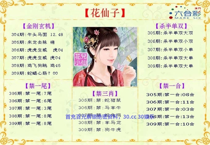 | 309期:【八仙过海】 【却将金雪作丹田,生理只凭黄阁老,一番萧索禁烟中,嘈嘈软语了宁切】 解:意思是金雪解出金肖猴鸡,雪解出冬肖鼠猪牛 生肖:虎鼠蛇兔马鸡 |